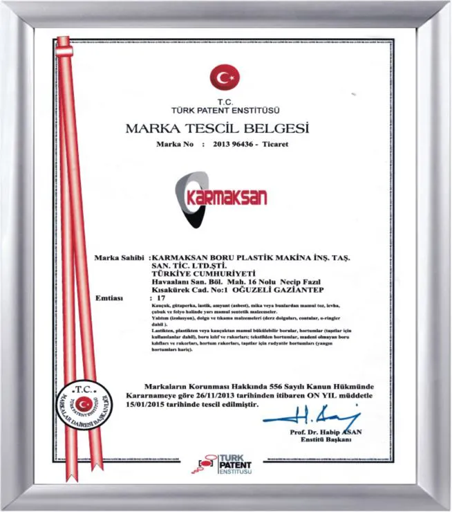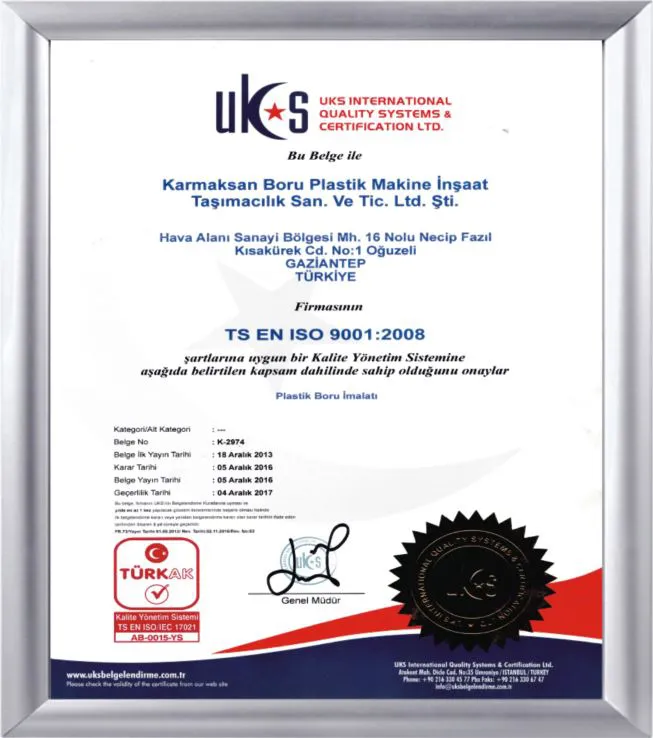 Karmaksan Boru yönetim sistemi kalitesi, uluslararası kalite belgelendirme kuruluşları tarafından ISO 9001:2000 kalite belgesine layık görülmüştür.